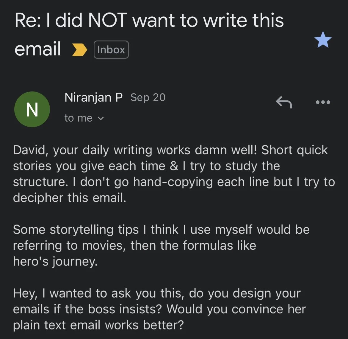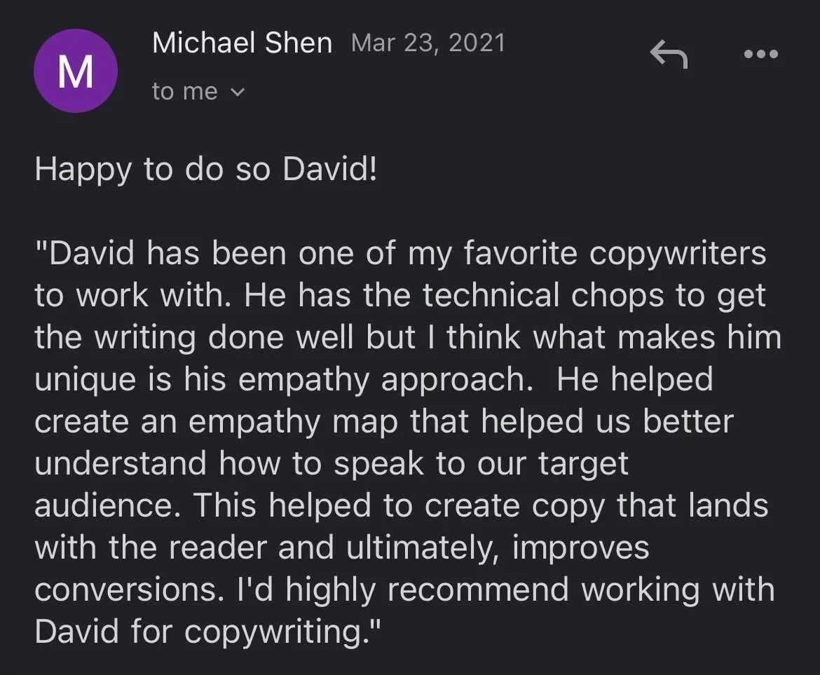 “I’m addicted to reading your emails, David … As a copywriter, subscribing to these was one of the best decisions I made.”